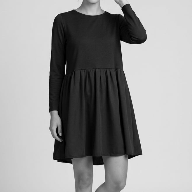 Samarreta llarga/vestit curt (fins a mitja cuixa, aprox) de bambú de color negre i amb frunzit de tencel. Peça acampanada i amb molt caient. Ideal per a l'entretemps. Disponible en dues talles , S (36-38) i L (40-42).